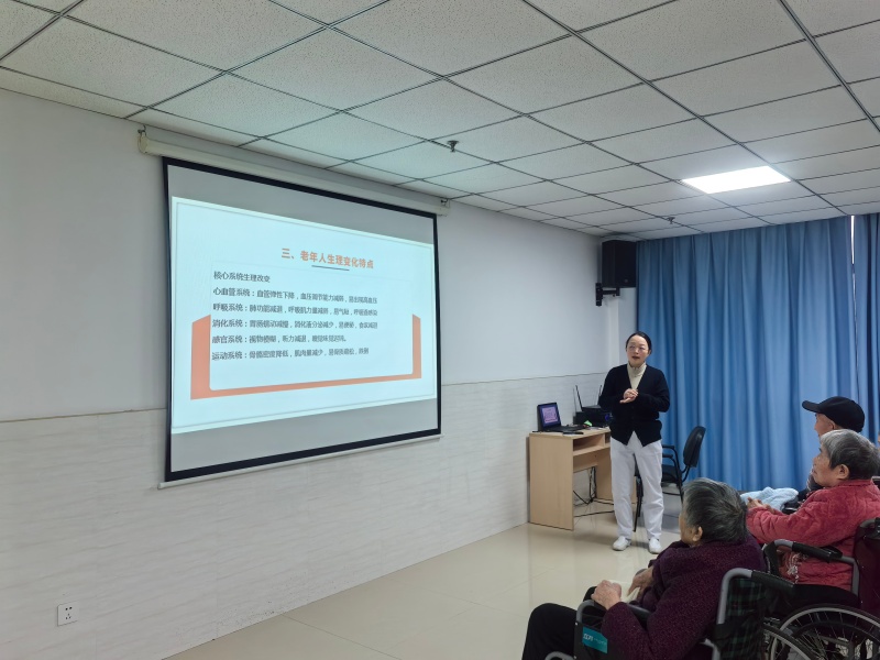 講座現場,朱芳結合多年臨床經驗,圍繞“老年人健康知識”“老年人心理特點”及“老年人全方位護理”三大主題展開系統講解。在健康知識板塊,她針對老年慢性病預防、日常飲食營養搭配及科學運動方式等內容進行細致科普,強調“預防優于治療”的理念;在心理特點分析環節,她深入剖析老年人常見的孤獨感、情緒波動與適應障礙,并提出“多傾聽、常陪伴、善引導”的實用建議;在全方位護理實操環節,則從生活照料、身體護理及應急處理等多方面提供具體可操作的指導。