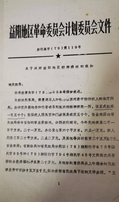 1979年9月5日,為解決烈軍屬、榮譽(yù)退休軍人和社會救濟(jì)對象中精神病人的治療問題,益陽地區(qū)革命委員會計劃委員會批準(zhǔn)興建益陽地區(qū)精神病院。[益計基字(79)第119號]